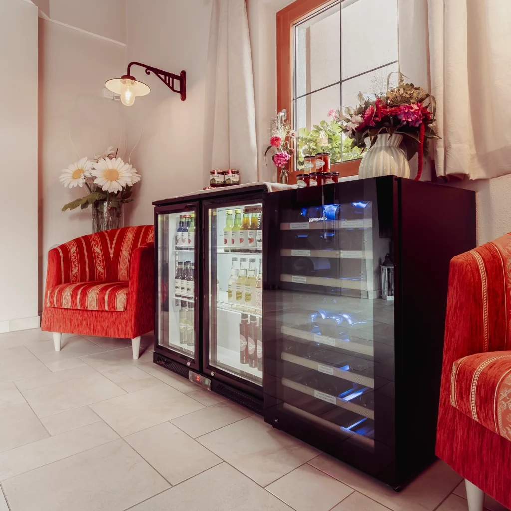 Für den kleinen Genuss zwischendurch gibt’s unseren SB-Kühlschrank – gefüllt mit Waldhonig, Marmeladen, Säften, Sirupen sowie feinen Weinen und spritzigen Drinks aus Österreich.